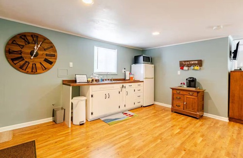 A convenient one-floor studio cottage that requires no steps to access. The kitchenette includes a fridge, microwave, Keurig, hot plate, Foreman grill, and an air fryer (on request). You are welcomed from the gate with a koi pond and fountain. The Studio is comfortable and welcoming, no matter the Oregon weather. The gate is secured with a combination lock, and the cottage door has a smart lock and guest-specific entry code. If you need to get some work done, we have a laptop table and an HP Officejet printer available. This is a super convenient location to the airport! The cottage also has WIFI 5G for your convenience.