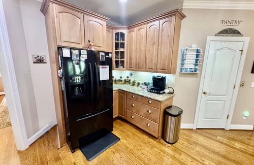 Four of our five bedrooms are on the 1st floor with our spacious kitchen, dining room, and living area with a large smart TV.
