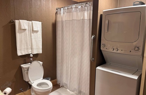 Inside, you’ll find a well-appointed layout featuring one queen bed, one full bed, two twin beds in the loft, and twin bunk beds, making it ideal for families or friends traveling together. The cabin includes one full bathroom, stocked with fresh towels, toiletries, an iron and ironing board, and other essentials to make your stay easy and convenient.
