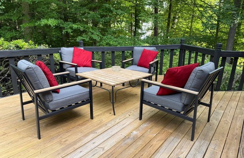 This Norman Zimmerman-designed contemporary home is located in the prestigious Old Emerywood Community. Surrounded by beautiful mature trees, this comfortable home features vaulted ceilings, a massive stone fireplace, and stunning secluded views. Our NC family rental boasts custom-made furniture, office space, we are located close to HPU & High Point Market, this pet-friendly rental is a great location for exploring High Point, NC.