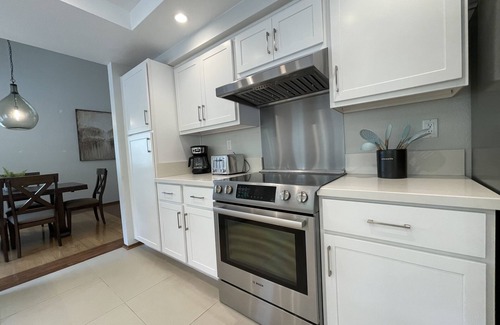 The kitchen boasts custom cabinetry, quartz countertops, stainless steel appliances, a Bosch dishwasher, Keurig coffee maker, and a built-in water filtration system. Fully stocked with all the essentials—cookware, dishes, glassware, silverware, and more.