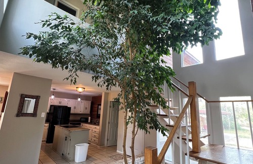 Spacious, comfy lodge nestled on a peaceful property. Perfect for groups & families. Kids will love the large yard as you relax outside on the covered patio + BBQ. A large stocked kitchen makes meals a breeze! Say hi to our friendly donkeys + goats that are on the backside of the property. Feed them treats and give them pets! A real ficus tree shares the staircase in the atrium for a unique experience.