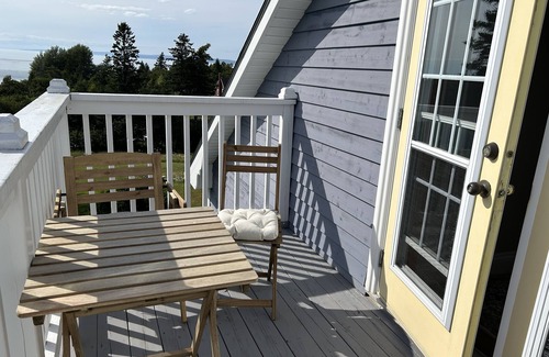 The High Tide Suite has a separate entrance in the property, and is upstairs in the guest house (8 steps). High Tide is a spacious and comfortable open plan suite with a king size bed, seating area with sofa bed, private bathroom, dining area with dining table seating four, kitchenette (fridge, microwave, coffee and tea making facilities - no cooker). High Tide also has a beautiful balcony with seating for four, fabulous views of the Bay of Fundy and is a special spot to enjoy the amazing sunsets.