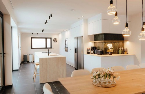 Unique, stylish modern and luxurious accommodation perfect for family and friends gatherings. Located on the outskirts of quiet Gistel in an oasis of green. The house is new and equipped with all modern comfort with 4 particularly spacious bedrooms with en-suite bathroom and toilet, large living areas with adjacent large open kitchen with American fridge, dishwasher and 2 ovens and pantry. In the garden is a large terrace (55m2) with awning and sauna with outdoor shower.