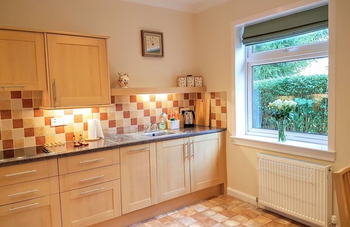 The long entrance hall has a large cupboard for coats and shoes. The L-shaped living area includes a bright and spacious sitting room with 3 seater and 2 seater settees, an ornamental fireplace, 43 inch HD Smart TV, HD DVD player, Bluetooth speaker and USB-C and USB charging points. Double patio doors from sitting room lead into a large west facing secluded garden which is shared with the main house owners. The dining area seats up to four people.