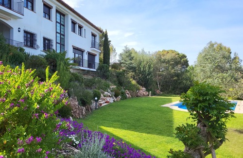 Villa construction 2006 with 2400m2 of land and 310m2 of living space, The most of Villa Pantanal is "a vast terrace" covered which include summer living room, dining room, barbecue area. What is nice is that the living space is so generous even when many people can keep their private space. 4 large bedrooms with 4 bathrooms, spread over two wings, comfort and privatized, ideal for two families. This one allows a very comfortable holiday for 9 people. . The pool is large in perfect condition. New bedding of good quality in all rooms. Large garden, large swimming pool of 6 x 12 m. Magnificent view of the valley and its golf course with the sea on the horizon. Very well equipped kitchen + washing machine and dryer,