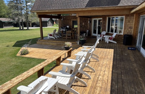 Whether you're savoring your morning coffee on the sprawling open deck, basking in the warmth of the sun, or stargazing under the vast night sky, the outdoor spaces at Brulee Point Lodge promise endless moments of serenity and joy. Retreat to the covered screen porch, complete with a wood-burning fireplace, for intimate gatherings and fireside tales. The large open front lawn is perfect for volleyball/badminton - all setup and ready for fun! There is also a 300 sq. ft. screened-in pavilion down by the water, which is another nice gathering space.