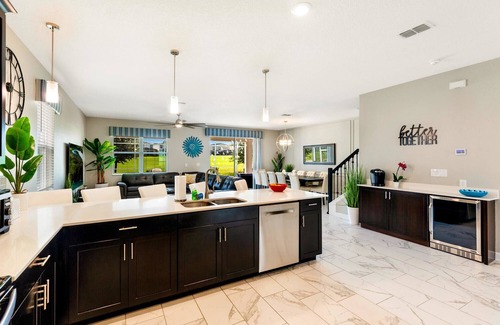 As you step into the Villa, you'll be welcomed by an open space adorned with contemporary design and vibrant decor. This sun-drenched, spacious floor plan seamlessly blends a gourmet chef's kitchen, living room, and dining area, creating an inviting and dynamic living space perfect for a family vacation.