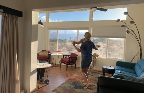 Rewrite & Retreat in the world renowned mineral hot springs pool & hot tubs at this Scandinavian bohemian tiny home with views of Palm Springs Tram and Joshua Tree National Park mountain range. Queen bed. Spectacular sunsets and hiking trails within steps. Private and serene with 180 degree windows facing westerly. 54" TV and Bluetooth Soundbar. This 55 & better community has fabulous 9 hole 3 par golf, pickle ball, tennis, gym, laundry facilities, hiking trails, dog parks and friendly people.