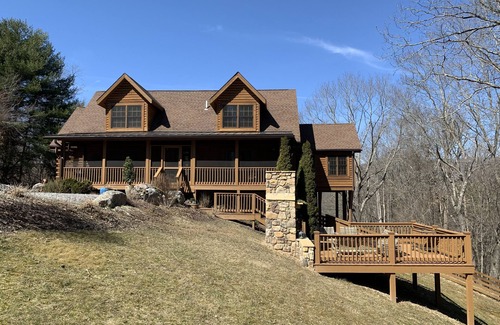Pristine log cabin on 5 quiet acres, walking distance to cycling, fishing, boating, and tubing on the Jackson River, 10 minute drive to The Homestead resort and its world class golf courses and ski hill, 15 minutes to Lake Moomaw, the best undiscovered lake in the region. Quick 5 minute drive to newly refurbished Jefferson Baths. Spectacular massive outdoor fireplace with private deck to view the shooting stars. Wrap around porch (partially screened) to enjoy the best of Bath County. INDOOR LIVING: WiFI, 2 flat-screen Smart TVs, dining table, gas stoves, hardwood floors, vaulted wood beam ceilings, open floor plan. Outdoor Ring security cams by garage and back deck. Sleeps 8.