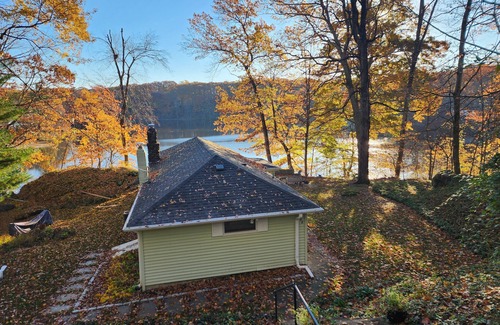 Breathtaking lakefront cabin in quiet, wooded area. Close to CT shoreline. Two bedrooms, one bath, full kitchen and dining room with wrap around windows onto lake. Private dock with kayak, paddle board. Also private beach on lake. Large living room with cathedral ceilings and working fireplace. TV in living room and master bedroom for Wi-Fi streaming. Brand new generator operates automatically, so that home will never lose electricity in the event of a regional power outage. New outdoor Weber grill. Brand new wireless HP DeskJet printer. Will consider cat but no dogs. Also note many stairs to navigate to and from house to street/lake.