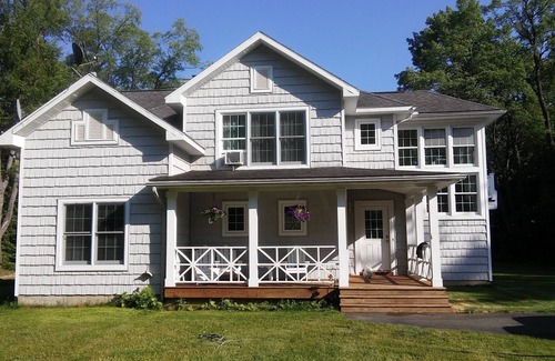 The home sits on a twenty two acre peninsula surrounded by water with a 1/4 mile of private beach front. The lakefront has a large private dock where you can enjoy fishing, swimming, boating or kayaking. There are two kayaks that come with the rental. In the front yard there is a large and beautiful lawn where you can play volleyball, have a camp fire or just enjoy the view. Hinckley Lake is a also winter paradise. Ski the Adirondack Mountains or directly access the Penn Mountain snowmobile trails.