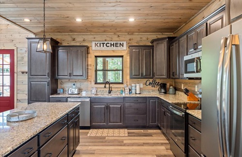 This mountain lodge offers an open main floor living area with a formal living room flanked with an electric fireplace, formal dining room, and a spacious kitchen. The kitchen is equipped with granite countertops, stainless steel appliances, and is fully stocked with all the necessities including cookware and utensils.