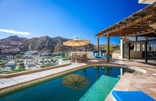 Perched alongside a cobblestone street in the prestigious community of Pedregal, Old World charm meets modern sophistication, as Villa Bella Vista delights its guests with sweeping private views from its own swimming pool and glass-railed sundeck. Relax on one of its poolside lounge chairs or under its Pergola. The panoramic outdoor space also includes a barbeque and shaded dining table, a Jacuzzi, and steps leading up the home's upper-level terraces. Start your morning here with a cup of coffee, or watch the sun set at the end of the day with a cocktail.