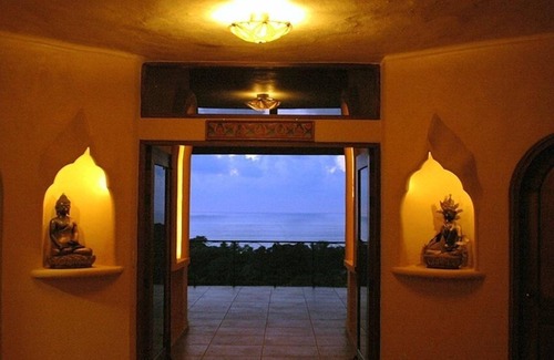 Villa Karuna is a two story 3000 sq ft. romantic beautiful home and has been custom handcrafted throughout. Attention to detail is evident in the marble, onyx, granite and tile work in the kitchen and the bathrooms, as well as in the artwork, the statues and surrounding beautiful gardens. Located in one of the last remaining tropical jungles by the sea in Mexico, Villa Karuna, sits high on a jungle ridge overlooking the Pacific Ocean. The beautiful, expansive view includes magnificent sunsets over the sea as well as an ongoing bird watching opportunity.