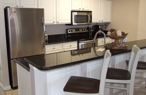 The fully equipped kitchen has stainless steel appliances and granite counter tops. A full size dining room table easily seats 8 and there is additional seating for 4 on the stools at the kitchen bar.
