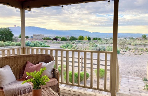 Breathtaking Views of the City Lights by night and the Sandia Mountains by day! There is a balloon launch field very nearby, so it's very likely you'll see hot air balloons during the day. This thoroughly updated manufactured home is extremely comfortable, fresh and clean, Linens washed between guests, rugs and furniture regularly steam cleaned and sanitized. Granite kitchen counters, Stainless appliances, Gas range, Free wi-fi, Smart TV, Cozy Pellet stove, Washer/Dryer, Dog run area. Surrounded by big blue skies and open spaces. The front porch is very large, covered and cozy; there are quail, other various birds, rabbits, and interesting wild-life to view from this comfortable space. The home is private, neighboring homes are mostly custom homes on large lots. It's truly country living in the city, generally peaceful and quiet, and yet just a few minutes to shops, coffee, restaurants, groceries. Lowest Crime rate area per Trulia, School district rates among the highest!