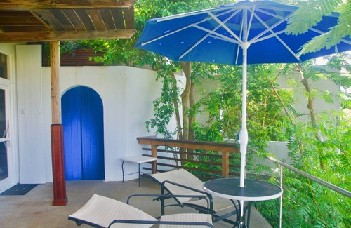 Located at the north end of the greater residence, hence, protected from southern exposure, the apartment enjoys a well-shaded interior - space white & bright and accepting of the cooling trade winds passing thru. Ceilings are high. The bedroom is large with a quality, king mattress. The bath is also large and well stocked. The kitchen/studio is fully equipped and interconnected with the bedroom thru two 6' wide archways.