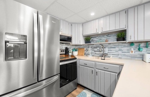 This amazing 2 BR 2 BA unit has such a "cool" vibe to it with its upscale modern design. Inside you will find newer flooring throughout along with shiplap walls. The living room has a queen sleeper sofa and large TV. The dining room has a newer table and chairs along with a coffee station with a Drip and a Keurig coffee maker. The kitchen has a tile back splash and stainless-steel appliances and is ready to make those cost-saving meals at home. The first bedroom has a pyramid style bunk bed with a full-size bed on the bottom and twin on the top. It provides easy access to the hallway bath. The second bedroom has both a queen and full-size bed along with a private bath. There is a washer/dryer for guest use and free Wi-Fi. You'll find 2 sliders to access the large balcony, equipped with patio furniture for your outdoor enjoyment. Guests have access to the pool, which is great for cooling off on those hot summer days.