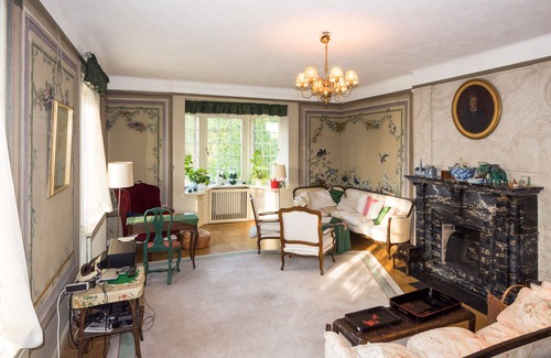 This distinguished property is perfect for family gatherings, featuring a spacious living room with a fireplace and several lounge areas. Fully equipped for up to 16 guests, it offers 8 double bedrooms, each with its own washbasin, 4 toilets, and one large bathroom. The house retains its original 1920s interior, including wall paintings.