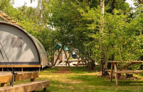 Sleeping in our Panorama Lodge is a real treat in a festival atmosphere! The Lodge has cosy, sheltered sleeping compartments, while the covered living area gives you the opportunity to immerse yourself in Twente outdoor life at a park with a festival atmosphere. Comfortable beds, check! A cosy seating area, check! Your own sanitary facilities, of course! The Lodge also has its own terrace and kitchenette with fridge. The sleeping compartments and bathroom are closed off, so you have enough privacy. The living area is covered, but mostly open. So you can hear the birds singing during dinner. The lodge tent consists of 2 bedrooms. 1 bedroom with a double bed and 1 bedroom with a single bed and bunk beds. The bunk bed is suitable for kids up to 12 years old. Also for the smallest there is room to place a cot. At our park, near the Panorama Lodge, there are various playing facilities for children. So you can have the time of your life with the whole family! These lodges are spread throughout our park, do you want to be sure of a spot on our pop-up glamping? Please indicate your preference in the booking process.