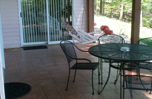Spike's Place is a ground level lakefront unit totaling 1400 sq. ft. All rooms are spacious and comfortably furnished. It has 1 bedroom with a connecting bath. The bedroom has a queen bed and a twin bed. All beds have pillow top mattress covers. The large great room has a dinette, full kitchen, living room furniture with a 57' HD Flat screen TV with BLURAY DVD Player. Xfinity TV Service and Wi-Fi High Speed Internet are included. The kitchen is fully equipped with stainless steel cookware, a cast iron skillet, 17 cu. ft. refrigerator, microwave, blender, toaster, Mr. Coffee coffeemaker and chef knives. The unit has cleaning supplies, vacuum, ironing board, iron and hairdryer. The tiled patio has wrought iron furniture, a porch swing and gas grill (propane provided). It does not have a dishwasher so you might want to bring paper products.