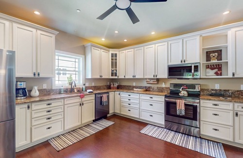 Enjoy the convenience of a full bath with a tub upstairs, a half bath, and laundry off the kitchen. Ideal for remote work, the quiet and walkable neighborhood provides a peaceful setting. Two adjustable bicycles are available for easy riding in the neighborhood, and the partially fenced backyard includes a fence enclosure for small dogs. The 12 x 20 shed space, known as the "Coastal Clubhouse," is a great spot for rainy day activities or small family gatherings, featuring an L-shape lounger and a table with seating for six.