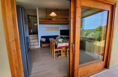 Ascend a staircase from the private parking, and you'll find yourself in a tranquil retreat surrounded by greenery with panoramic views. The house comprises a spacious room with a double bed and a single bed, a newly renovated bathroom with a shower cabin, a living room with a kitchenette and a sliding glass door to enjoy the scenery. In the living room, there's a wooden loft with a single bed and a half and a sofa bed.