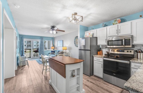 Our condo is non-smoking, but there is a designated smoking area right down the steps from our front door. There are queen beds in each bedroom, as well as a queen sleeper sofa with a foam topper for added comfort in the living room. There is a tv and DVD player in each bedroom, as well as a 55” flat screen tv and dvd player in the living room. We are located on the 1st floor convenient to the ramp for easy unloading. We also have a closet with beach toys, and an extra air mattress for extra kiddos. The kitchen is fully equipped for all your needs, with all new appliances. We also have wonderful Wi-fi throughout the complex.