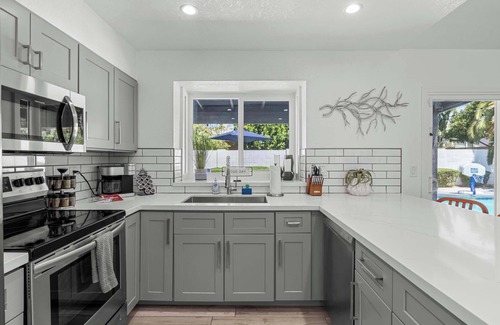 Inside, the living area is bathed in natural light, featuring cozy, gray sofas that invite you to relax. Tasteful black-and-white photography and art add a touch of sophistication to the room. The kitchen is both stylish and functional, with stainless steel appliances, white countertops, and a central island with red bar stools, creating a vibrant space for cooking and socializing.