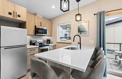 With two cozy bedrooms featuring queen beds on the main level and a double pull-out couch upstairs (sleeps one guest), this cabin is ideal for small groups or families. Upstairs, you'll find a fully equipped kitchen, complete with a dishwasher and a kitchen island that seats four—perfect for fueling up before your adventurous day. The cozy living room provides an ideal space to relax with a good book or enjoy a few board games. Step outside onto the upper deck to take in the natural forest surroundings. The cabin also features a washer and dryer, making it an excellent choice for longer stays.
