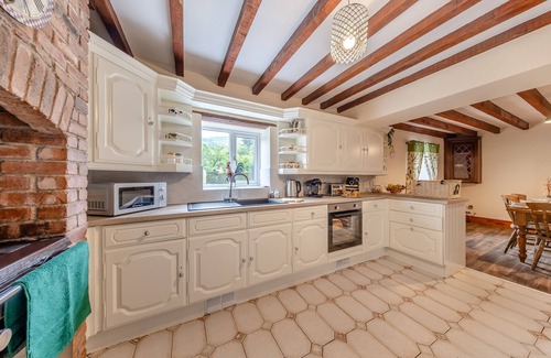 2 bathrooms – 1 bathroom with shower, bath and WC and 1 en-suite shower room with WC Electric oven, plug-in hob/hot plate, large air fryer, large fridge, microwave and Bosch pod coffee machine