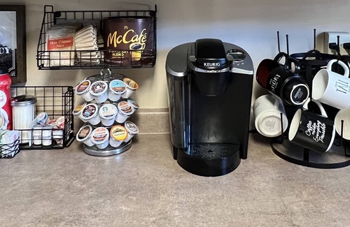 Stove/Oven. Full size Fridge. Dishwasher. Microwave. Coffee Station with Coffee Pot and Keurig Machine. Silverware. Plates. Cups. Pots and Pans.