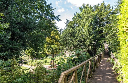 A hidden Victorian garden with lush greenery, Gothic ruins, and a peaceful atmosphere—perfect for a quiet escape.
