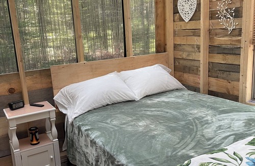 Cabin 10’by10’ built with reclaimed rustic distressed natural weathered lumber, private, fire pit, benches, picnic table and hammock. The Cabin is 100’ from Old County Road and 200’ from the parking area.
