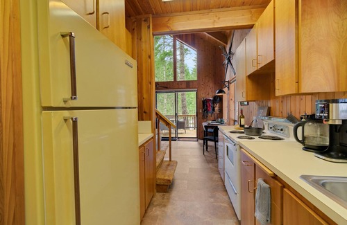 The cabin is thoughtfully equipped with all the amenities needed for a comfortable stay, including a well-appointed kitchen with a charming vintage stove, ensuring that you have the option to prepare meals and enjoy them in the cozy dining area. Outside, you’ll find a large deck with outdoor dining al fresco and a propane firepit for classic campfires.