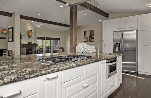 With the new modern kitchen, guests can easily prepare elaborate meals, and have lots of counter space, modern appliances, including Viking, Fischer Paykel double oven, warming drawer, large refrigerator freezer, dishwasher and 2 prep sinks. Guest bath is convenient to kitchen and a quick stop from the pool.