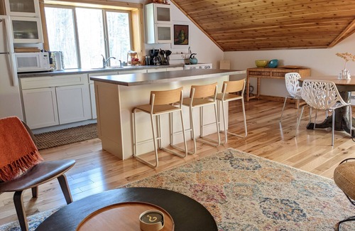 Beautiful, comfortable, spacious and relaxing 1 bedroom/1 bathroom guesthouse on north end of the island. Wifi. There is a smart Roku TV for streaming your online accounts, but there is no cable. Very clean and comfortable. Enjoy this quiet corner of the island, still close to town but tucked away in a wooded area. Newly built in 2017. Solid hickory floors throughout. Queen bed in the bedroom, and a queen pull out sofa in living room. Lots of seating in the living space. The kitchen has everything you need for living at home (except a dishwasher.) The apartment is located above our garage and has a separate entrance and deck. Enjoy being outdoors using the fire pit (wood bundles available for purchase at the hardware store) and gas grill. You are a short walk away from lake Michigan where you can take in the sunrise and sunset. The space is located 2 miles from town and also 2 miles from Donegal Bay, which is a wonderful beach for swimming and sunsets. Check in is at 3:00 p.m. and check out is at 10:00 a.m.