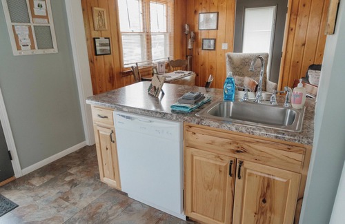 This cabin is fully furnished and equipped with everything needed for a comfortable stay including a washer/dryer and laundry detergent. The kitchen includes a drip coffeemaker, full sized refrigerator, stove, oven, microwave, dishwasher, hot water kettle, pots and pans, utensils and kitchen towels. Free WiFi Internet service is also included.