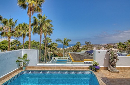 Enjoy a stunning ocean view tropical villa with heated private pool and large terrace, located in the most quiet and luxurious neighborhood in Adeje.