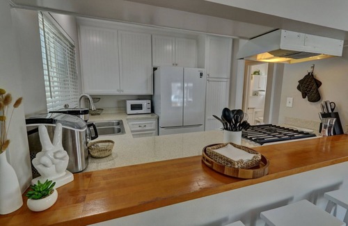 The fully equipped kitchen offers everything you need to prepare meals at home, and it opens up to both the indoor dining area and the outdoor patio making it easy to entertain and enjoy indoor-outdoor living.