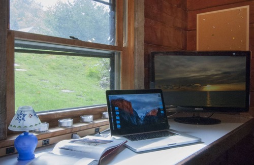 The cabin is a quintessential log home with added ambiance of Persian carpets, a library stocked with novels and coffee table books, and a comfy place to curl up in front of a fire to read and relax. There is a trail on the property that leads up into the Green Mountain National Forest and the Breadloaf wilderness and past a waterfall. Swimming holes are along the route. Great for walking the dog, or a snowshoe in the winter.