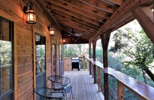 Come and relax with us in your own private cabin in the treetops nestled on the bluff overlooking the creek bed and surrounded by the Texas countryside.