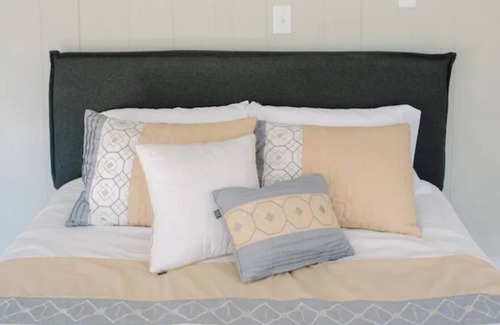 A bright open space with large windows and high ceilings that compliment the view of surrounding foliage. A large screened-in porch at the front of the house is perfect for intimate gatherings. A hot tub is available alongside the house in addition to a two-person outdoor shower, and corn hole boards and a fire pit offer additional options for family fun. You won’t have cell phone signal out here -and the WiFi isn’t strong enough to run too many devices at one time.