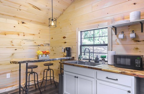 - NOTE: This single-story cabin requires a set of uneven exterior steps to enter