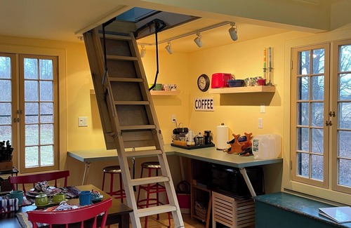 The kitchenette has a two burner stovetop; there is also a microwave, small fridge with freezer, electric kettle, espresso machine and drip coffee maker. BBQ for outdoor grilling. The loft bedroom is accessed by a pull down ladder that may not be suitable for some - a queen size sofa bed is in the living area. Not suitable for young children. Best for a couple. Dogs love the park-like setting and the brook.