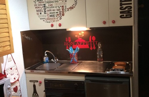 Description: Studio cabin 20 m², with kitchenette, new fridge, oven, microwave and kitchenware. Sleeping area with 1 double bed 140/190 slightly elevated (1 meter) and storage below, lounge area with sofa bed, flat screen 80 cm adjustable, CD micro-channel, bathroom with bathtub for shower, sink and toilet separated