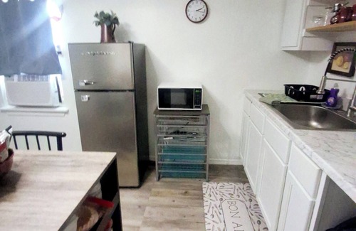 .... This studio is an attachment to the main house with separate entrance, with others renters on the surroundings units , Queen Bed, smart tv, kitchenette with microwave ,plates, cups ,utensils ,Window/Heather A/C .. perfect for a good nights sleep,