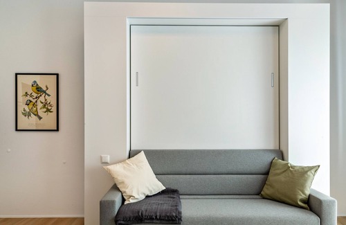 Lovingly restored and listed approx. 28 m² with living room/bedroom (with high-quality carpenter's cupboard bed), well-equipped kitchen and beautiful shower room/WC. The bed can be folded up during the day and turned into a couch. Room height approx. 3m. There is room for two.