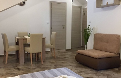 Studio apartment with one double bed and one sofa, perfect for three persons. The apartment contains a toilet, air conditioning, TV and free internet! Secured parking in front of the house.The apartment provides a unique warmth space that is woven combination of furniture made of wood and stone, which will stay home done is more pleasant and unforgettable! Guests will also be able to enjoy the wonderful views of the mountains and the sea!